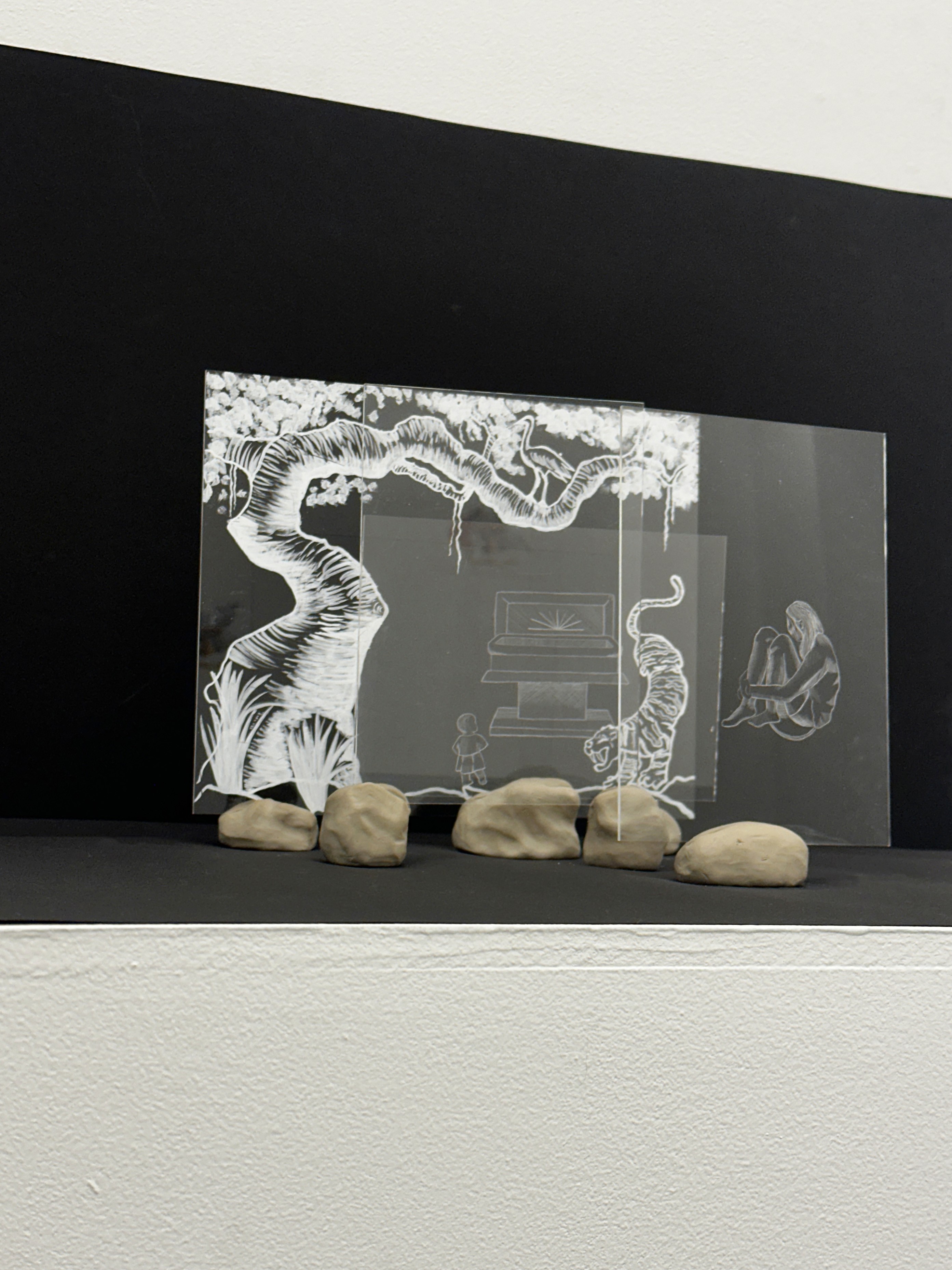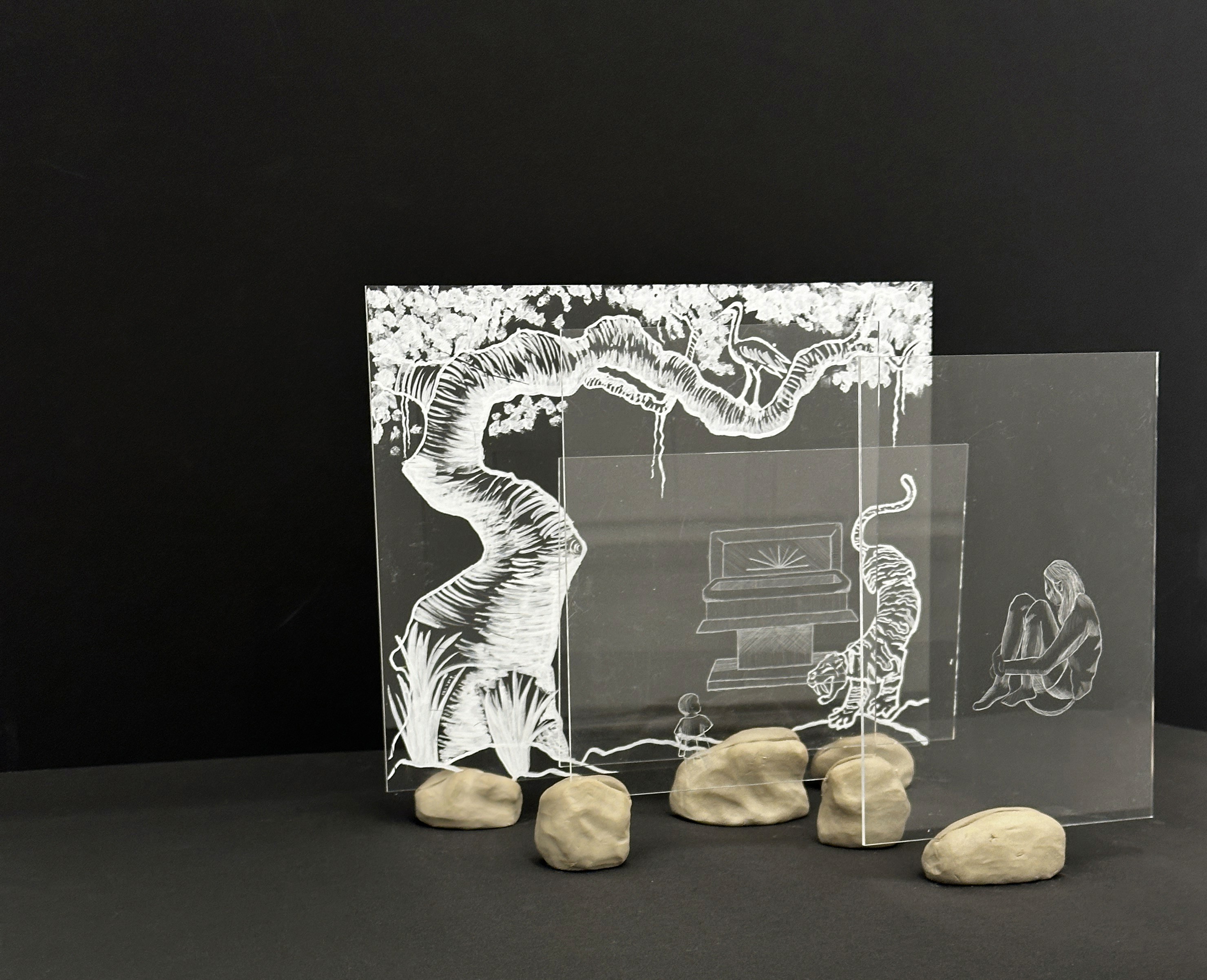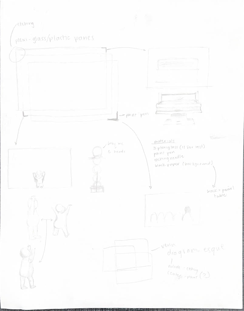 In the final piece, I arranged three plexiglass etchings to created a layered image. I used acrylic paint to create Mother of Pearl motifs for the background of the arrangement.