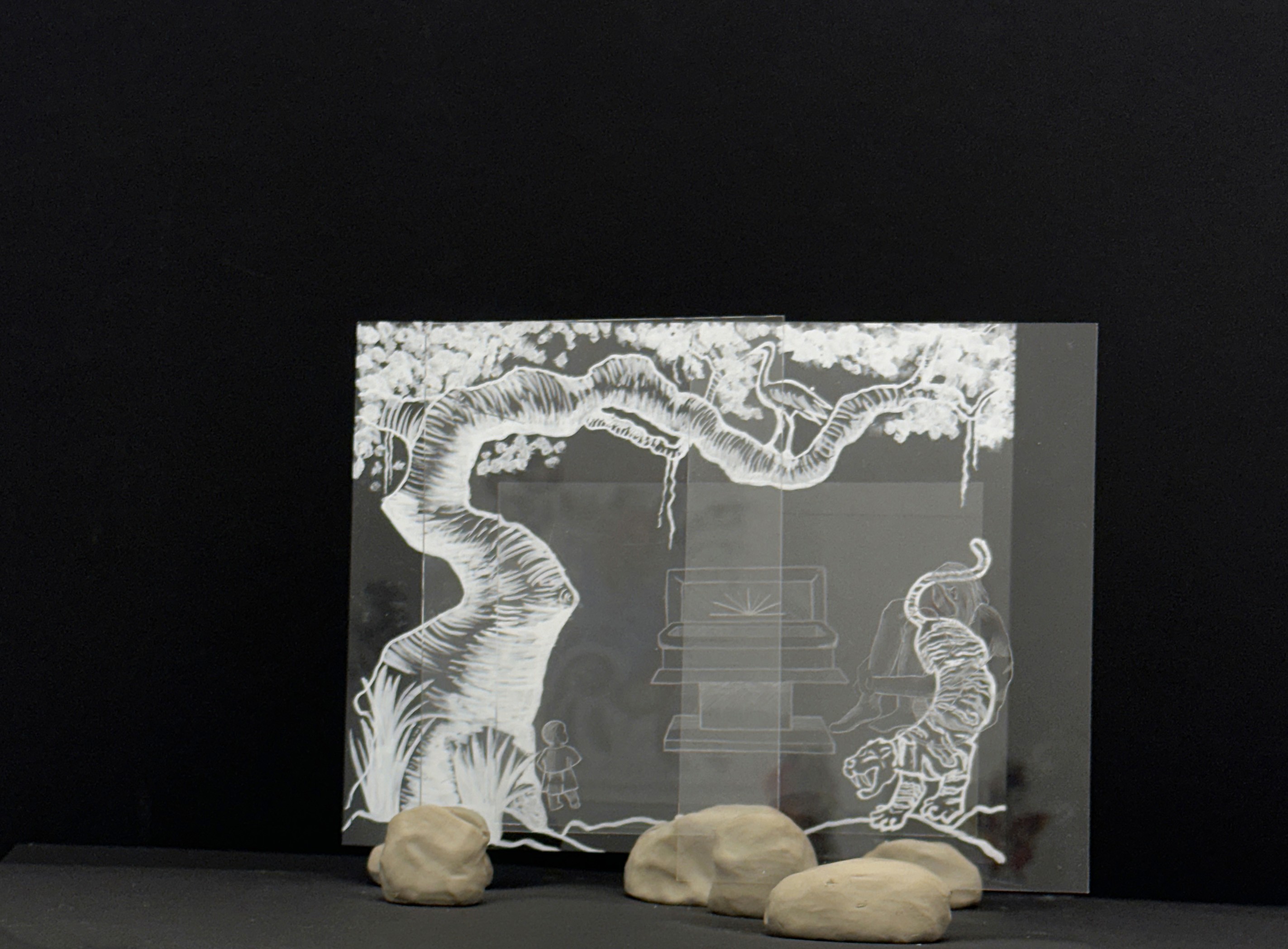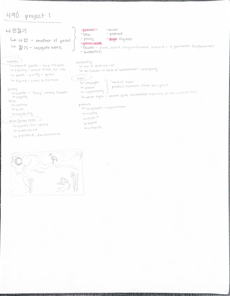 I wanted to use this piece to reference my grief for my grandmother who was my primary connection to my Korean heritage growing up. I started by researching Mother of Pearl motifs that I could include in my piece. From there, I sketched composition drafts that would help me properly layer the plexiglass images to create a cohesive image.