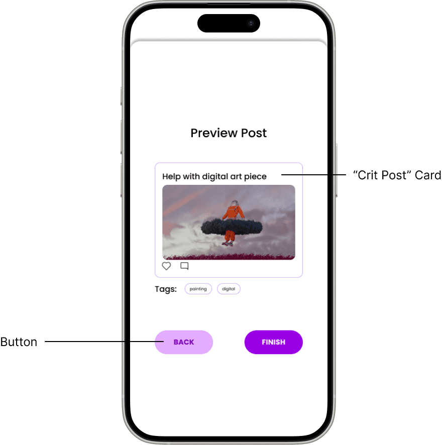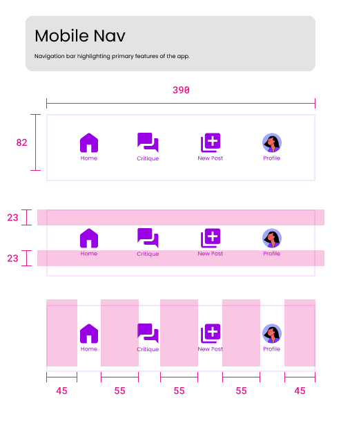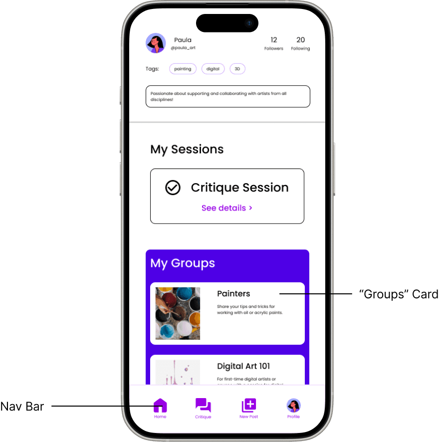 One of the most important parts of art is connecting with other artists to gather inspiration, receive critique, and ultimately find community. I wanted to design an app that would help users easily connect and schedule critique sessions with friends.