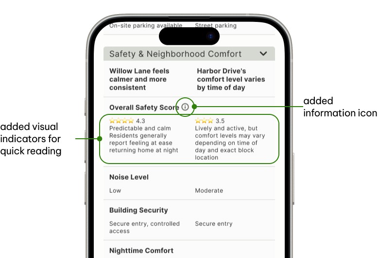 Users can choose listings to compare and get in-depth summaries of what life looks like in each neighborhood and how well the listings fit their needs.