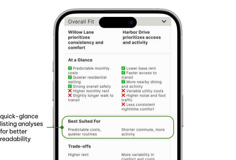 A listing comparison tool that provides personalized, in-depth summaries that help movers quickly evaluate how each listing fits to their lifestyle.