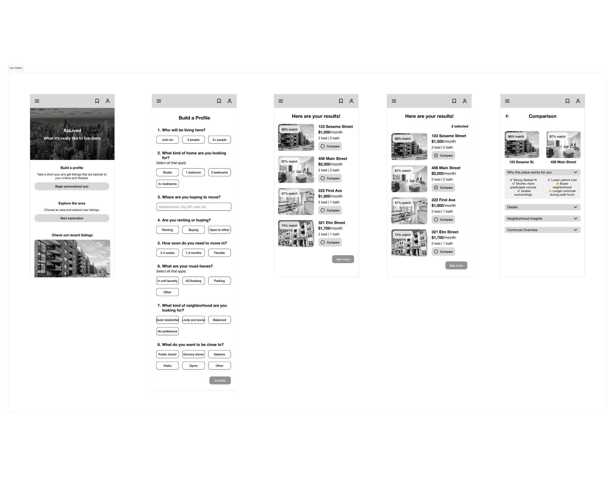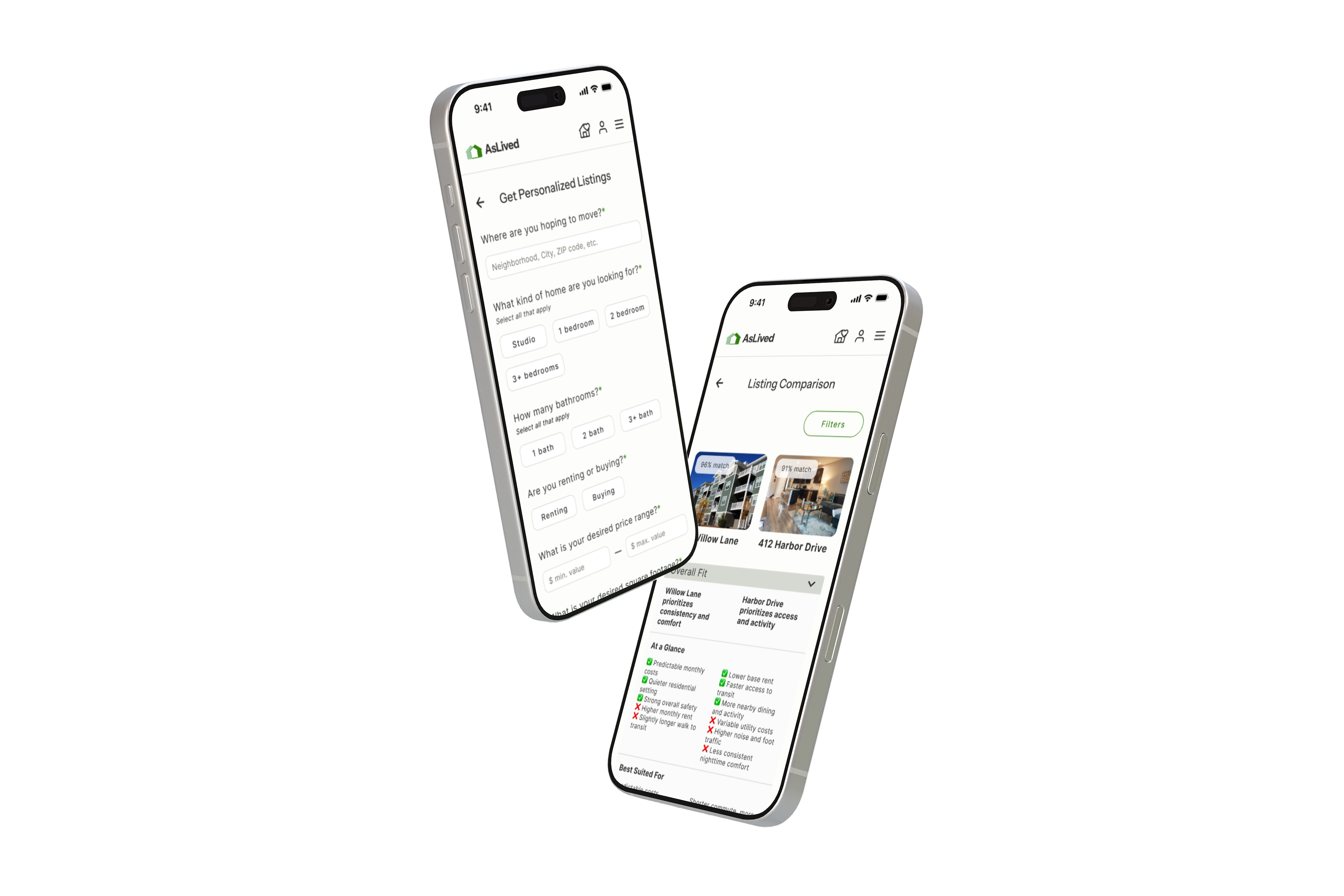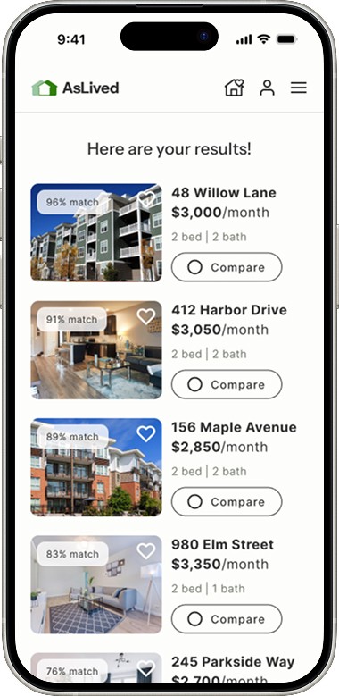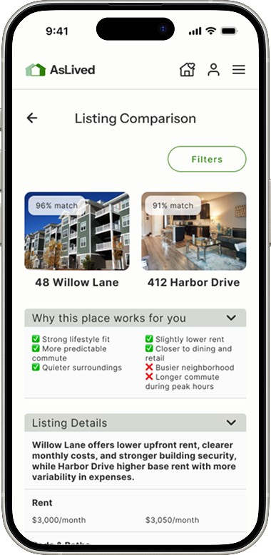 AsLived is a listing comparison tool that provides users with personalized listing recommendations and comparison details.