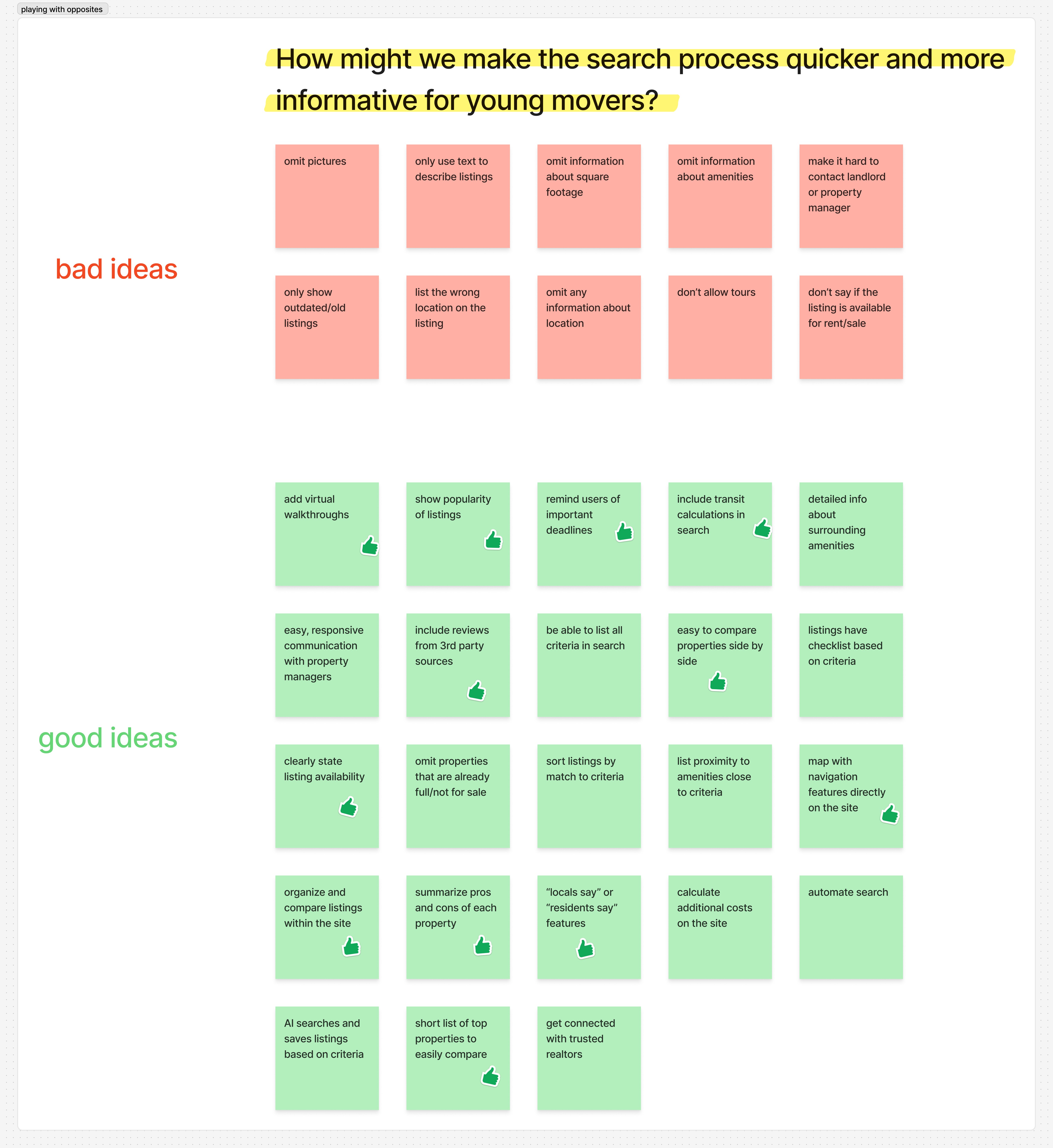 I started brainstorming using the "playing with opposites" exercise to generate "bad ideas" as a base to come up with more helpful solutions. At the end of the exercise, I grouped similar ideas into an affinity map.