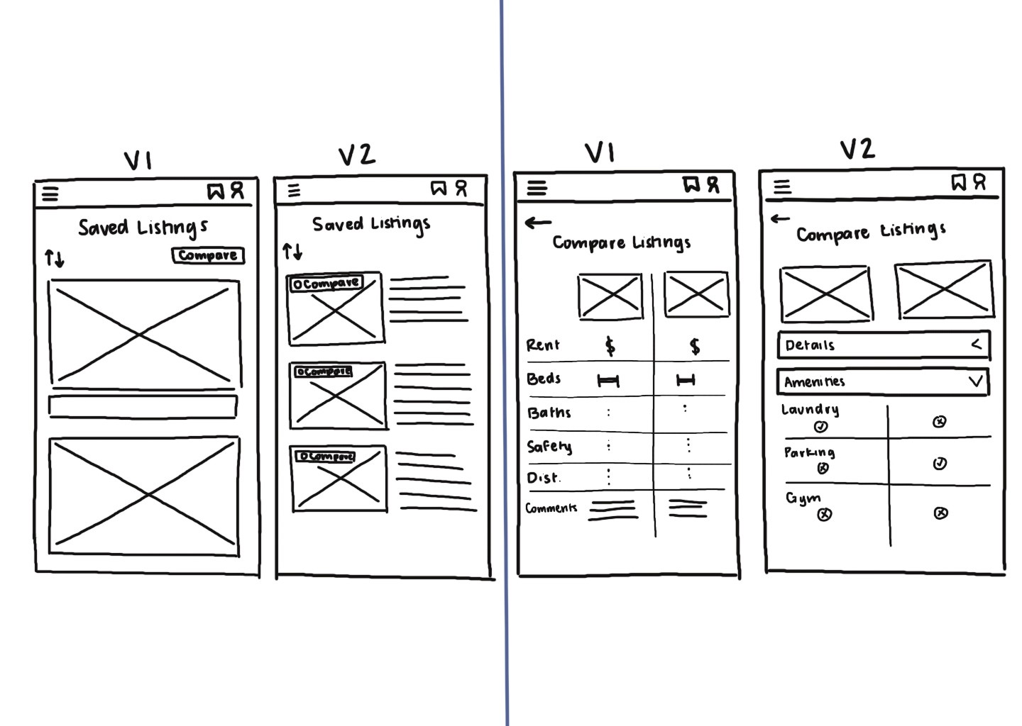 Many participants found it hard to find the saved listings page because the icon was small on their screens. Since the home is more prominent in the initial design, participants mistook the icon for the home button. I decided to make the heart larger and more noticeable as the saved listings icon.