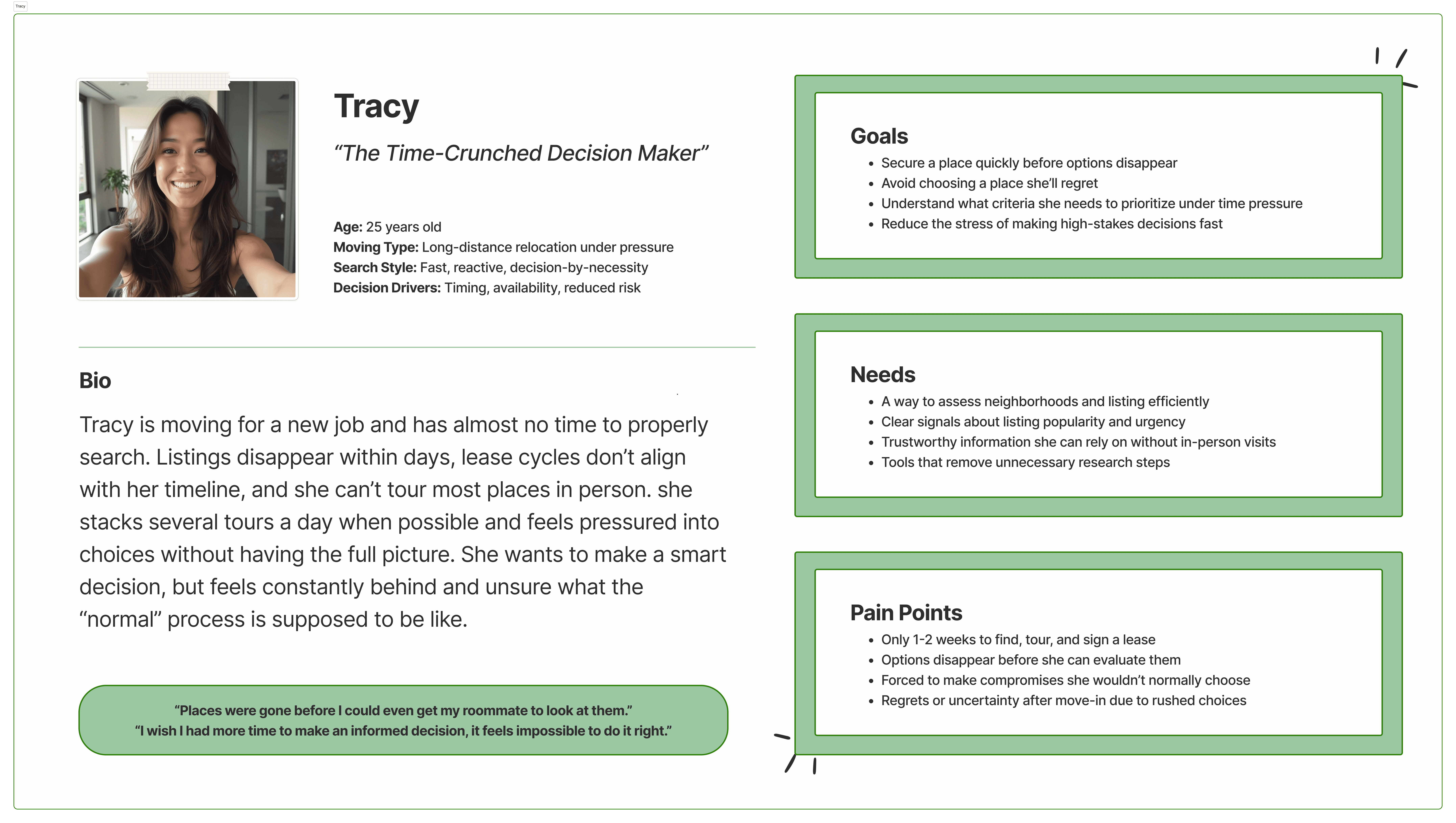 I want to explore ways to help movers get information about their desired place quickly because they often have limited time to search and make a decision, creating even more pressure to commit to a place that may not fit all their needs and expectations.