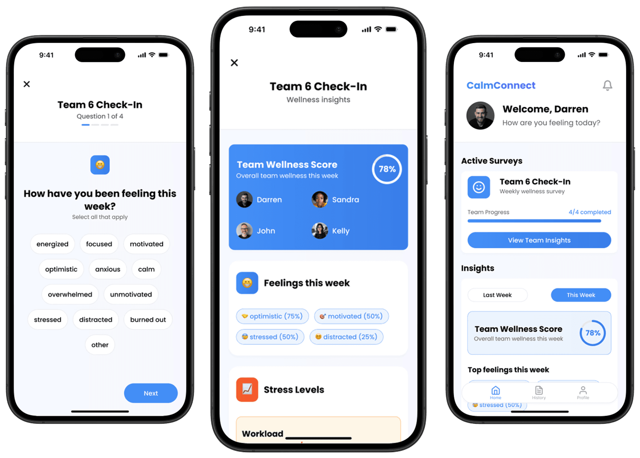CalmConnect gathers data from quick, anonymous check-ins from team members and visualizes patterns through clear, data-driven dashboards. The result helps normalize mental health discussions and empowers managers to respond with care and awareness.