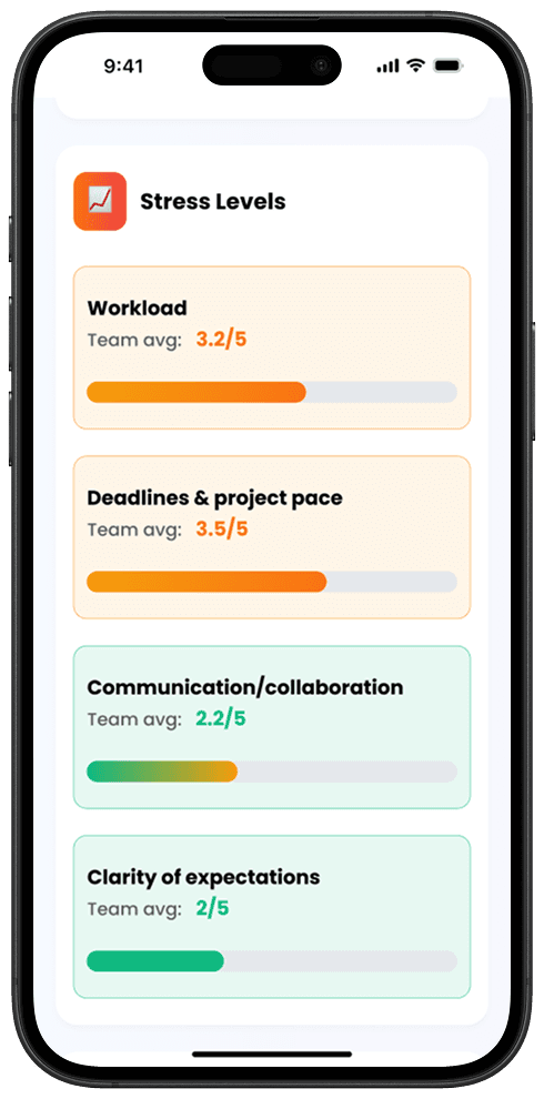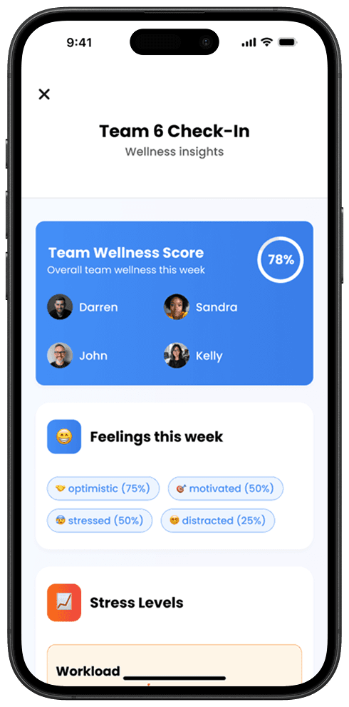 The mobile dashboard gives employees a quick, anonymous summary of how their team is doing. Color-coded visualizations make it easy to understand mood distribution, top stressors, and progress without judgment or comparison.