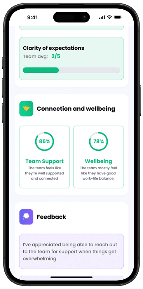 The team survey features a short series of reflective prompts that measure stress levels, workload, and emotional wellbeing. By keeping the surveys simple and judgment-free, we turned mental health reflection into a sustainable habit rather than an obligation.