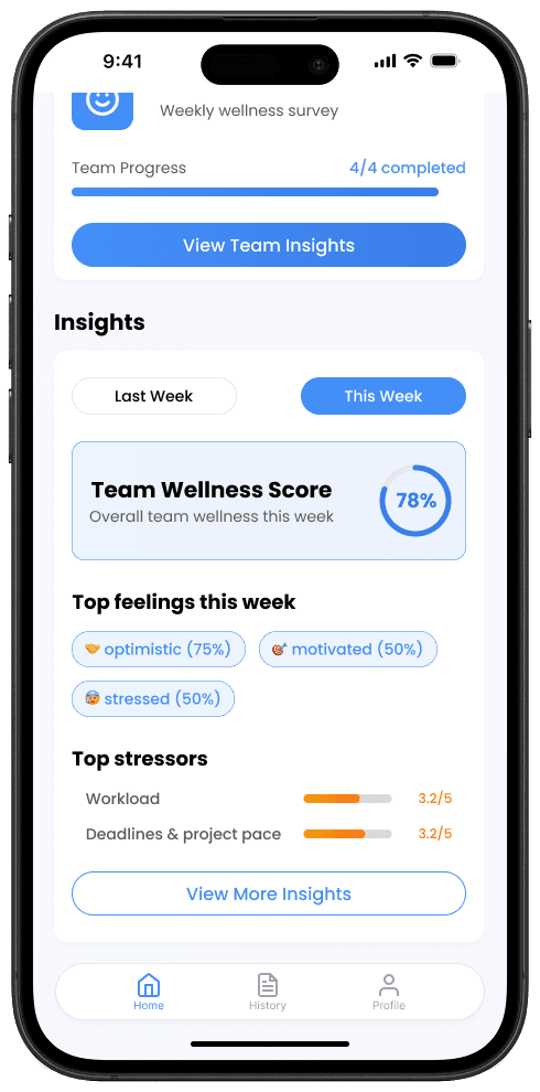 After submitting a survey: Insights are unlocked to reveal team-level wellness data.